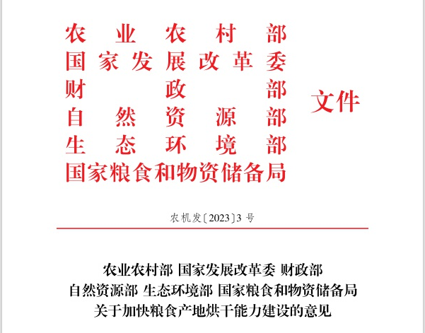 近日,農(nóng)業(yè)農(nóng)村部、國家發(fā)展改革委、財政部、自然資源部、生態(tài)環(huán)境部、國家糧食和物資儲備局聯(lián)合發(fā)布《農(nóng)業(yè)農(nóng)村部 國家發(fā)展改革委 財政部 自然資源部 生態(tài)環(huán)境部 國家糧食和物資儲備局關于加快糧食產(chǎn)地烘干能力建設的意見》。
