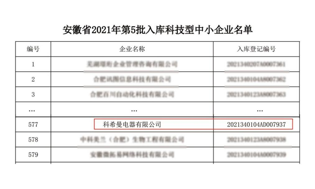 近日,安徽省科學(xué)技術(shù)廳發(fā)布《關(guān)于2021年第五批入庫科技型中小企業(yè)的公告》,科希曼電器有限公司成功入選安徽省2021年第五批入庫科技型中小企業(yè)名單。